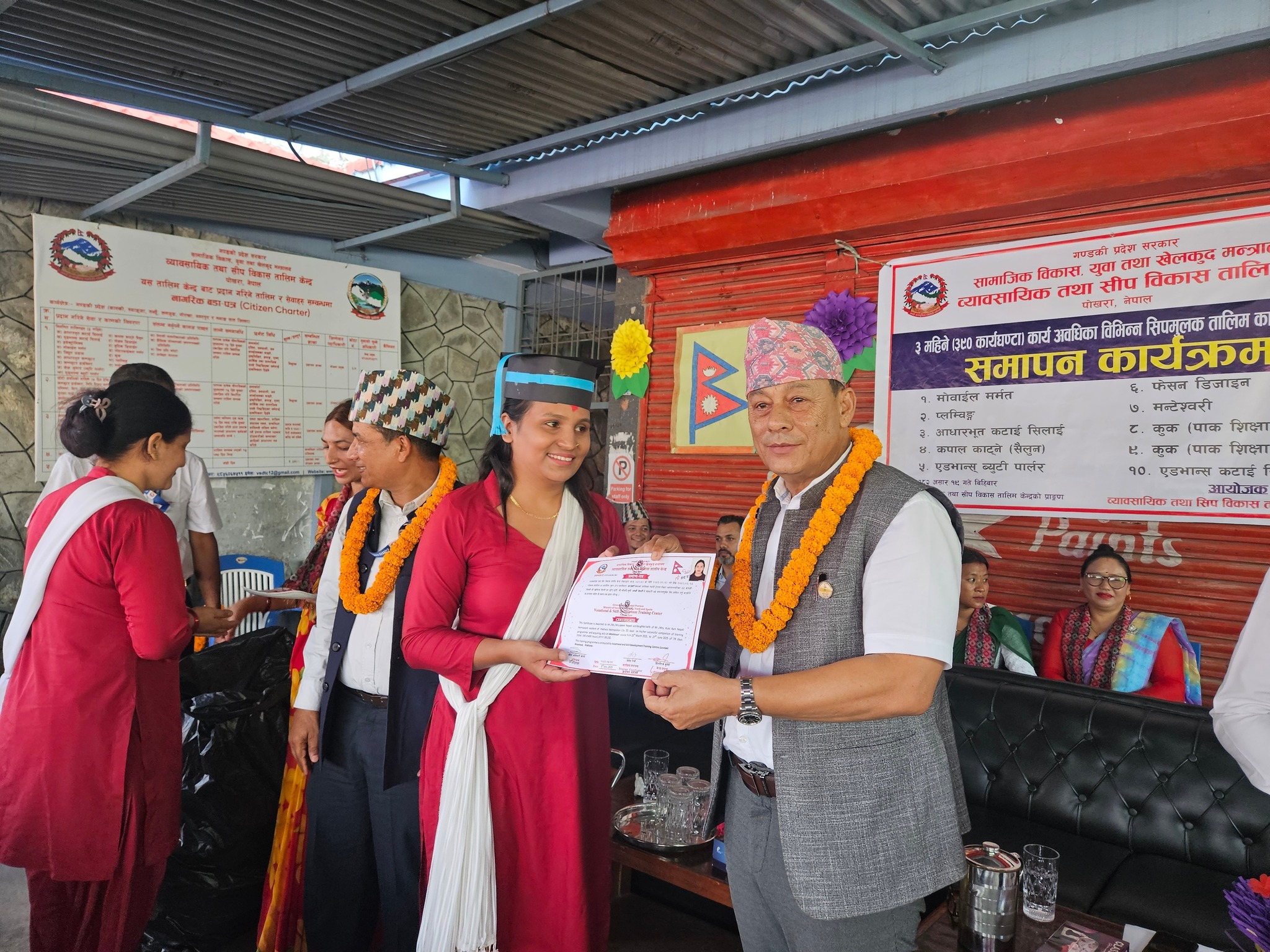 कार्यक्रममा व्यावसायिक तथा सीप विकास तालिम केन्द्र पोखराका नि.केन्द्र प्रमुख डिल्लीराज सुवेदीले तालिम उत्साहजनक रूपमा सम्पन्न भएको बताए । स्वावलम्बी बन्ने यात्रामा तालिमले टेवा पुग्ने विश्वास उनको छ । उनले पछिल्लो ३ महिने तालिममा मोबाइल मर्मत, प्लम्बिङ, सिलाई–कटाई, ब्युटी पार्लर, फेसन डिजाइन, सैलुन, मण्टेश्वरी, कुक (बिहानी÷दिवा), र एडभान्स कटाई–सिलाईजस्ता १० थरिका व्यावसायिक तालिम उपलब्ध गराइएको जानकारी गराए ।
