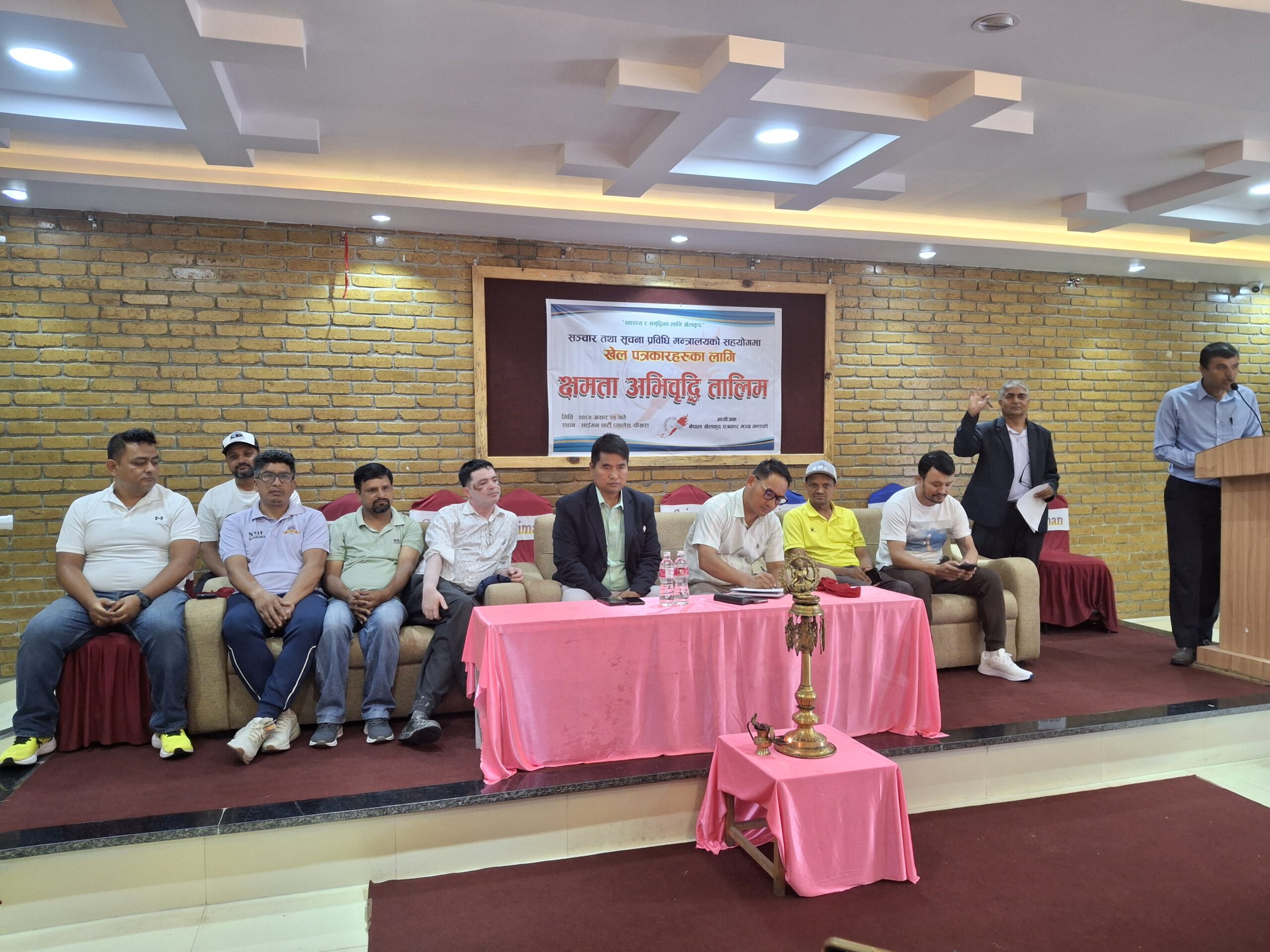 पोखरा, २० असार ।नेपाल खेलकुद पत्रकार मञ्च गण्डकीको आयोजना र सञ्चार तथा सूचना प्रविधि मन्त्रालयको आर्थिक सहयोगमा खेल पत्रकारहरुका लागि क्षमता अभिवृद्धि तालिम दिईएको छ । शुक्रबार भएको तालिममा गण्डकी प्रदेशमा रहेका विशेषगरि खेल क्षेत्रमा रुची राखेका क्रियाशिल पत्रकारहरुलाई भलिवल, एथ्लेटिक्स र क्रिकेट सम्वन्धि प्रशिक्षण गराइएको हो । खेलका नीति, नियम तथा मापदण्डका बारेमा बुझाउँदै पत्रकारले समाचार लेख्दा बुझ्नुपर्ने विषयका बारेमा समेत प्रशिक्षित गराइएको छ ।