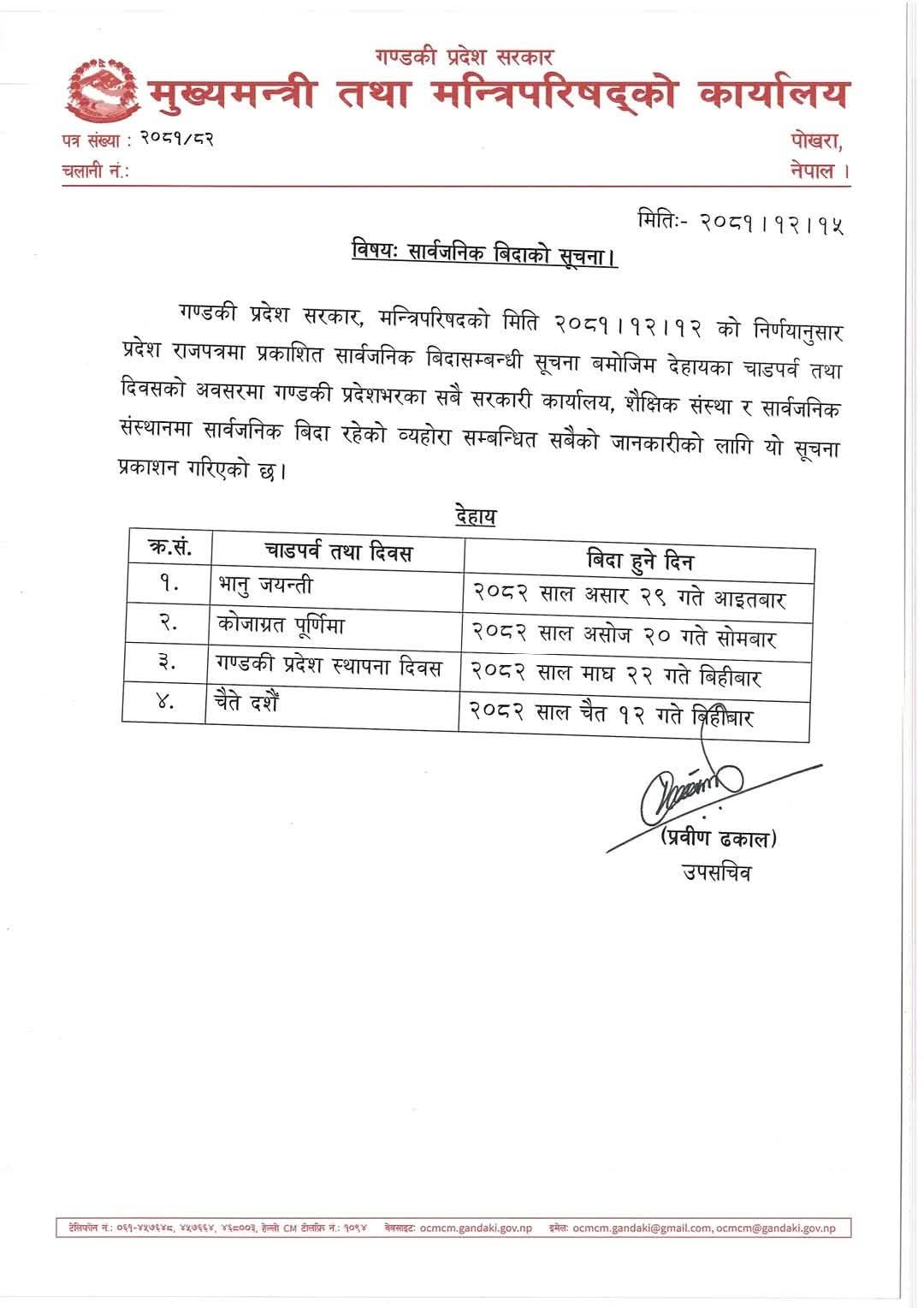 पाेखरा, असार २८ गते । गण्डकी प्रदेश सरकारले असार २९ गते भानु जयन्तीका दिन बुधवार प्रदेशभर सार्वजनिक बिदा दिएको छ ।