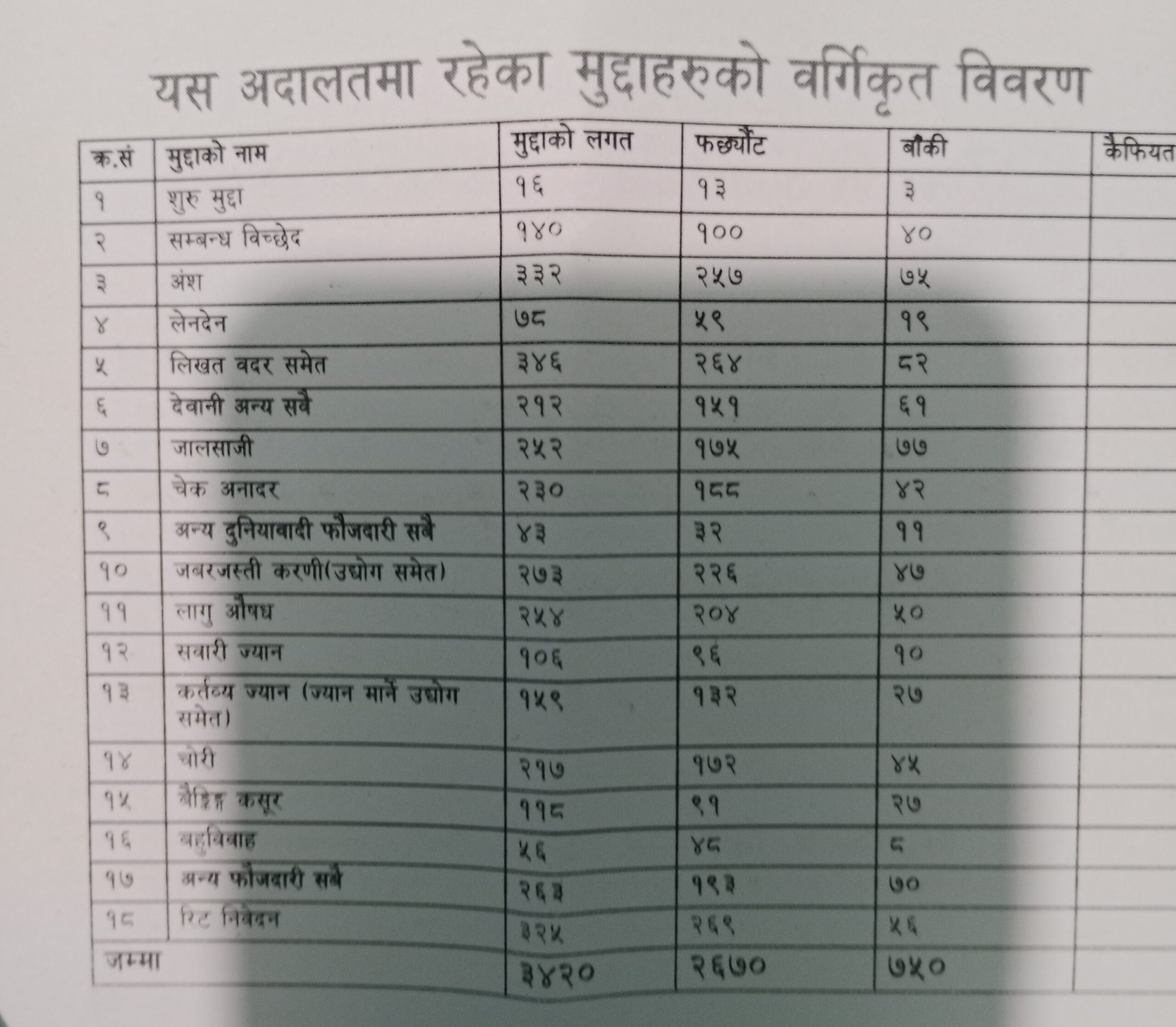 पोखरा, असार ३२ गते ।उच्च अदालत पोखराले लक्ष्यले लक्ष्य भन्दा बढि मुद्धा फछ्यौट गरेको छ । पोखरामा आज पत्रकार सम्मेलन गरेर वार्षिक लग्य र प्रगति विवरण सार्वजनीक गरेको हो
