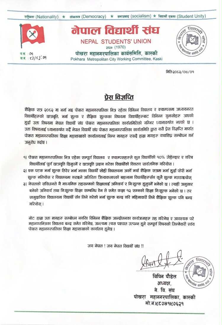 विज्ञप्तिमा नेपाल विद्यार्थी सङ्घ पोखरा महानगरपालिकाका अध्यक्ष विपिन पौडेलको हस्ताक्षर रहेको छ ।