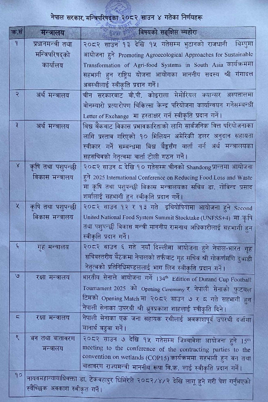 काठमाडौँ, साउन ७ गते । मन्त्रिपरिषद् बैठकका १० वटा निर्णय सार्वजनिक भएका छन् । सरकारका प्रवक्ता एवम् सञ्चार तथा सूचना प्रविधि मन्त्री पृथ्वी सुब्बा गुरुङले नियमित पत्रकार सम्मेलन गर्दै साउन ४ गते बसेको मन्त्रिपरिषद् बैठकका १० वटा निर्णय बुधबार सार्वजनिक गर्नुभएको हो ।