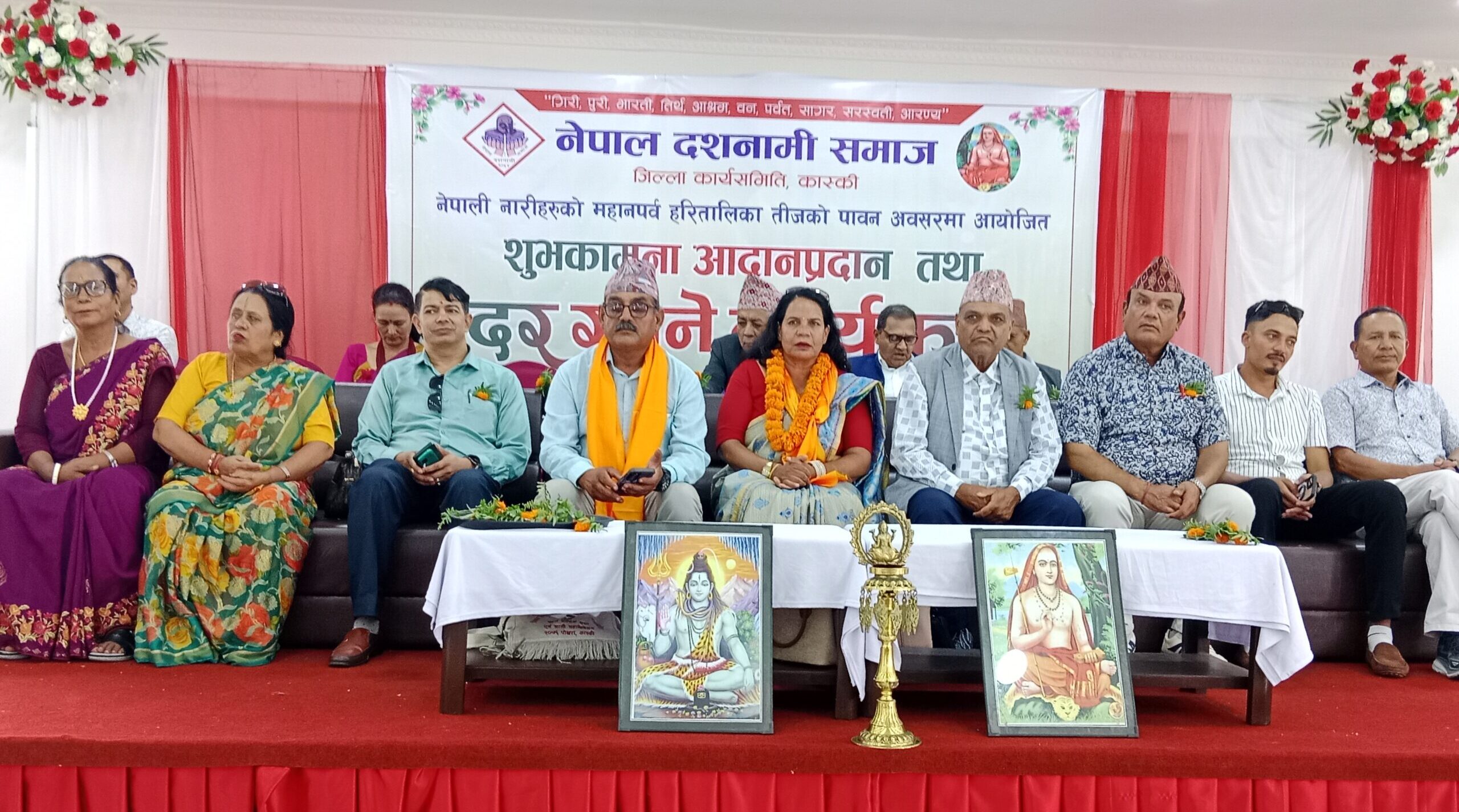पोखरा, भदौ ५ गते । नेपाली नारीहरुको महान पर्व हरितालिका तीजको अवसरमा नेपाल दशनामी समाज कास्कीले शुभकामना आदानप्रदान तथा दर खाने कार्यक्रम बिहिबार सम्पन्न गरेको छ । कार्यक्रमको उद्घाटन नेपाल दशनामी समाज केन्द्रीय समितिका उपाध्यक्ष सरस्वती गिरीले उद्घाटन गर्दै उपाध्यक्ष गिरीले दशनामीहरु वीच एकता कायम गर्दै मौलिक संस्कार र संस्कृति संरक्षण गर्नुपर्ने खाँचो औल्याउनुभयो ।