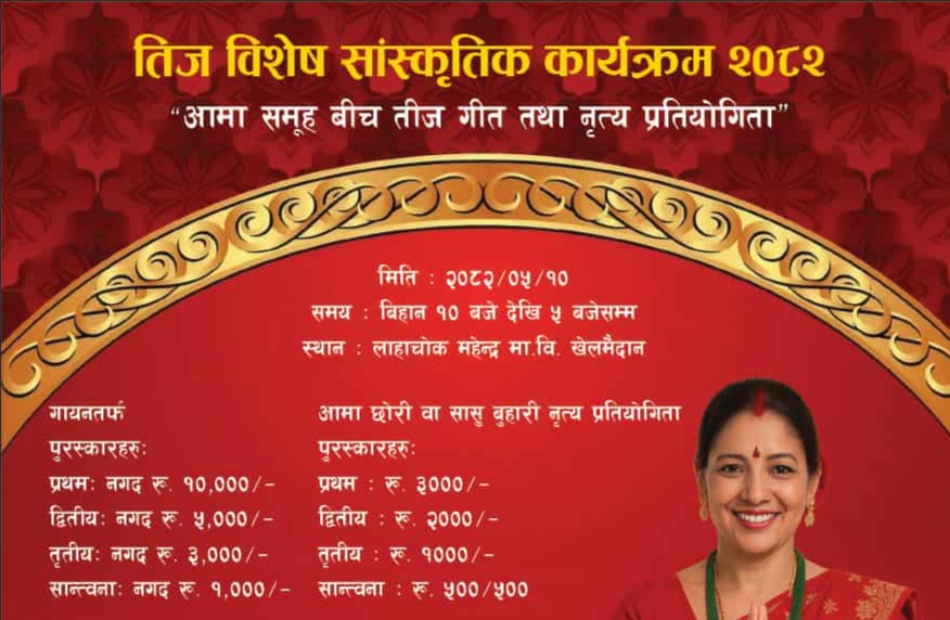 भदौ १० गते लाहाचाेक महेन्द्र माविको खेलमैदानमा हुने कार्यक्रममा आमा समुह वीच तीज गीत तथा नृत्य प्रतियाेगिता समावेश छन् ।