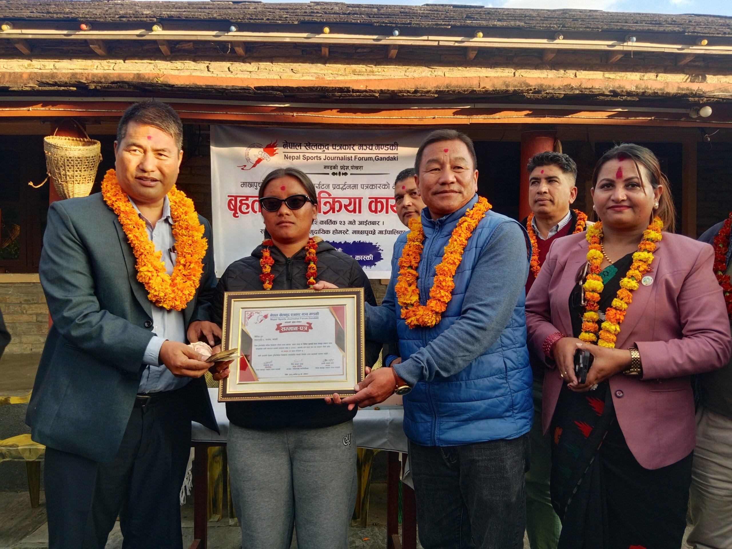 १२ देखि २३ नोभेम्बर २०२५ मा भारत र श्रीलङ्कामा पहिलोपटक आयोजना हुन लागेको टि–२० दृष्टिविहीन महिला विश्वकप क्रिकेट प्रतियोगिताका लागि नेपाली टोलीमा परेकी विनितालाई नेपाल खेलकुद पत्रकार मञ्च, गण्डकीले माछापुच्छ्रे गाउँपालिकाको पर्यटन प्रवद्र्धनमा पत्रकारको भूमिका विषयक अन्तरक्रियामा नगदसहित सम्मान गरेको हो ।
