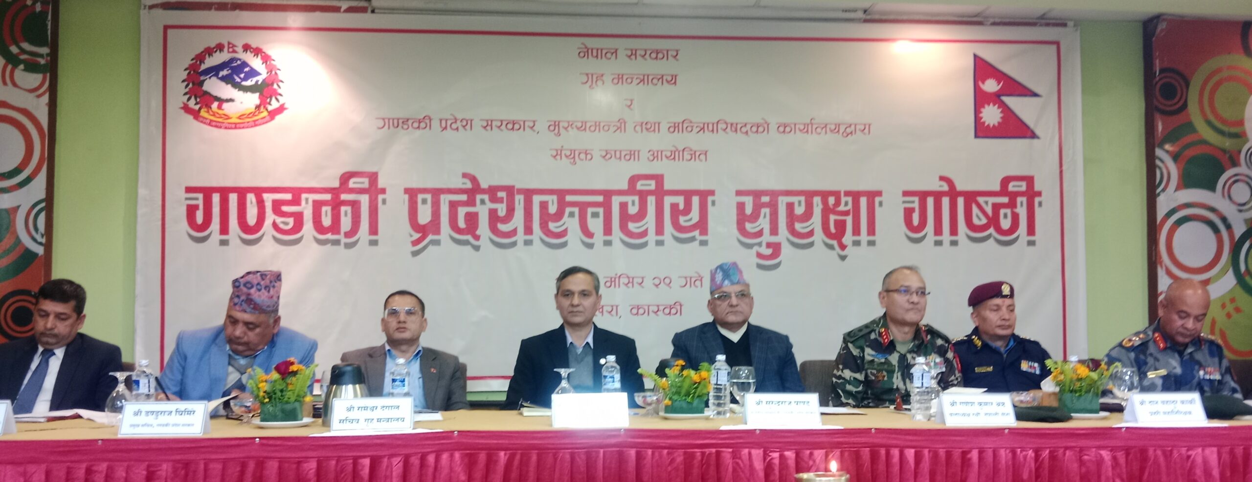 गण्डकी प्रदेशस्तरीय सुरक्षा गोष्ठीकाे उदघाटन गर्दै उनले राजनीतिक दलहरुले लुटिएका हतियार र फरार कैदी बन्दीलाई प्रमुख सुरक्षा चुनौतीको रुपमा औंल्याउनु भएको बिषय प्रति सरकार गृह प्रशासनले कार्यगरिरहेको समेत बताए ।