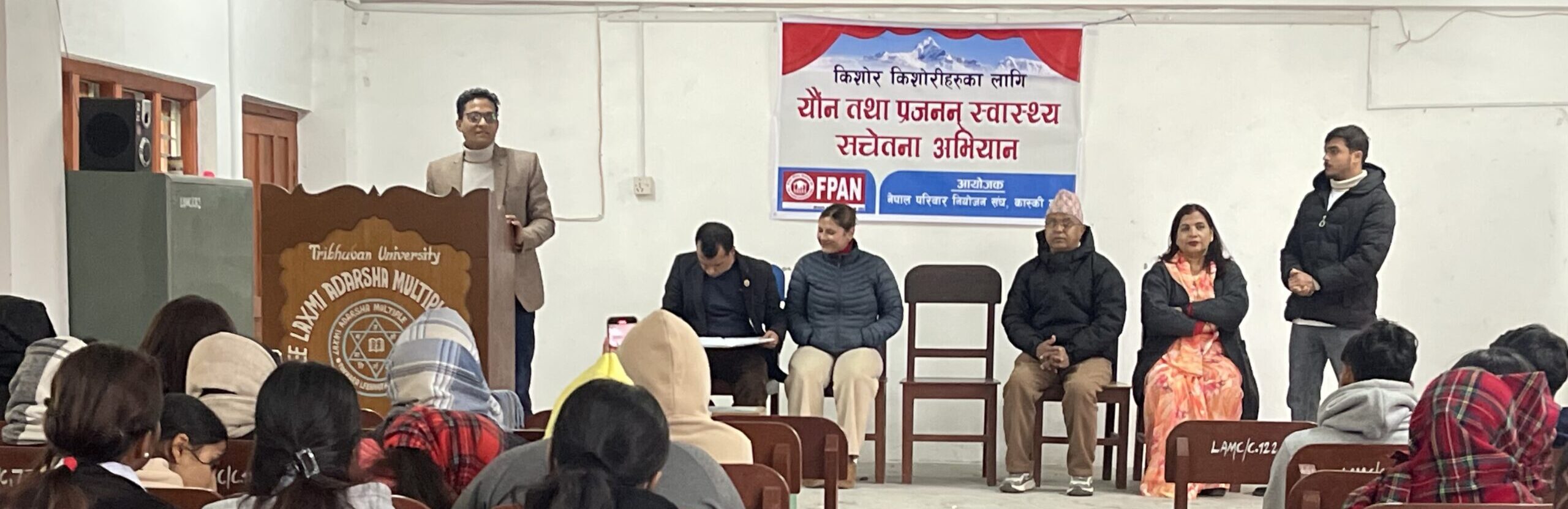 पोखरा, १ पुस । नेपाल परिवार नियोजन संघ कास्की शाखाले ११ वटा विद्यालय तथा क्याम्पसमा यौन तथा प्रजनन् स्वास्थ्य सचेतना अभियान संचालन गरेको छ ।२४ वटा विद्यालय तथा कलेजमा अभियान संचालन गर्ने लक्ष्य सहित भदौ १७ गतेदेखि अभियान संचालन गरिएको सभापति नवीन सिग्देलले जानकारी दिनुभयो । पोखरा महानगरपालिकाका १६ र गाउँपालिकाका आठ वटा विद्यालय तथा कलेजमा अभियान संचालन गरिने छ ।पछिल्लो समय पोखरा महानगरपालिका वडा नं ३२ स्थित गोगन मावि र पोखरा महानगरपालिका वडा नं २७ स्थित लक्ष्मी आदर्श बहुमुखी क्याम्पसमा अभियान संचालन गरिएको छ ।