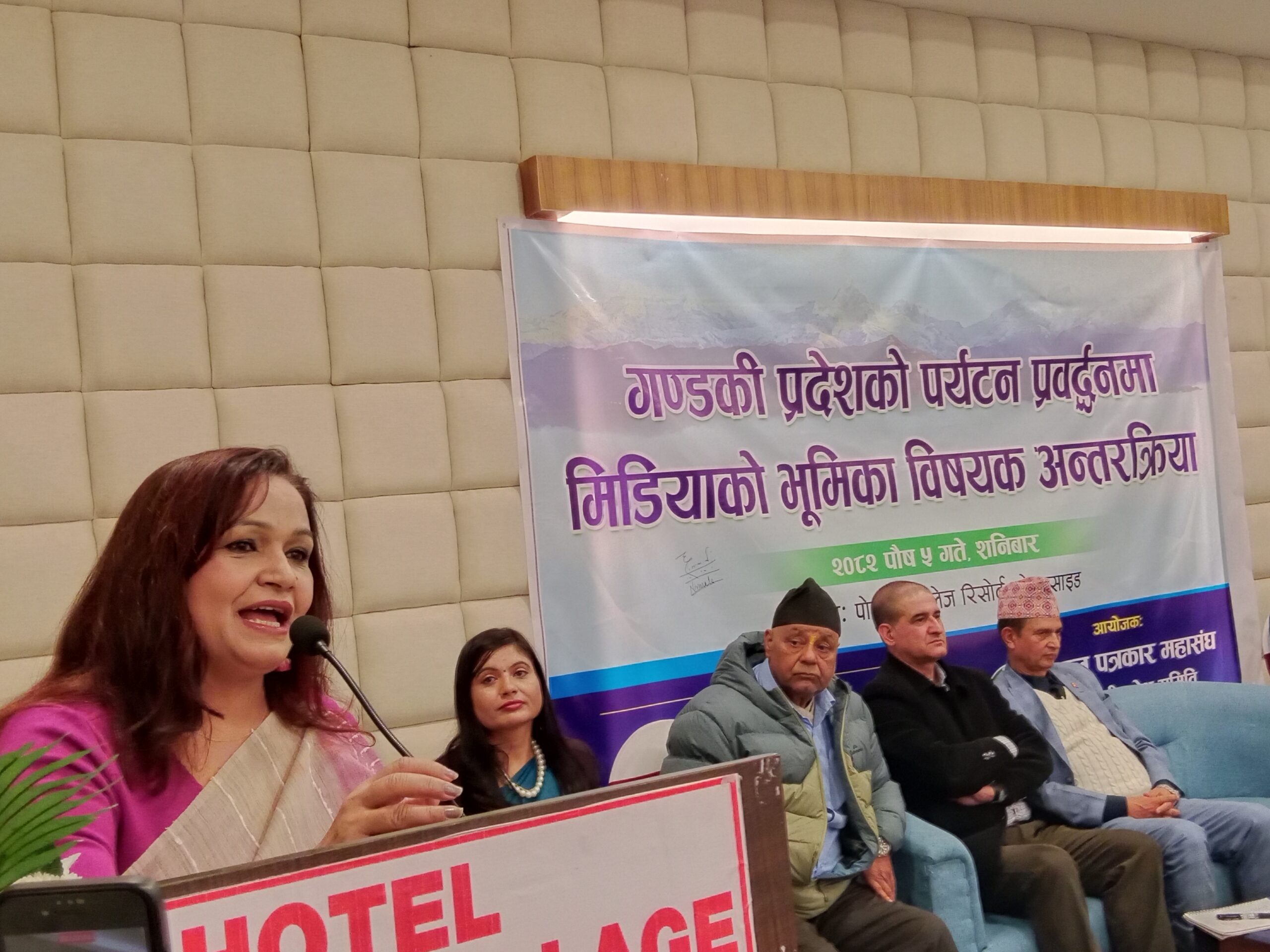 पोखरा । नेपाल पत्रकार महासंघकी केन्द्रीय अध्यक्ष निर्मला शर्माले पर्यटनसम्बन्धी स्पष्ट र प्रभावकारी नीति निर्माणको आवश्यकता औँल्याउँदै त्यसका लागि मिडियाले निरन्तर झक्झक्याउनुपर्ने खाँचो रहेको बताएकी छन्।