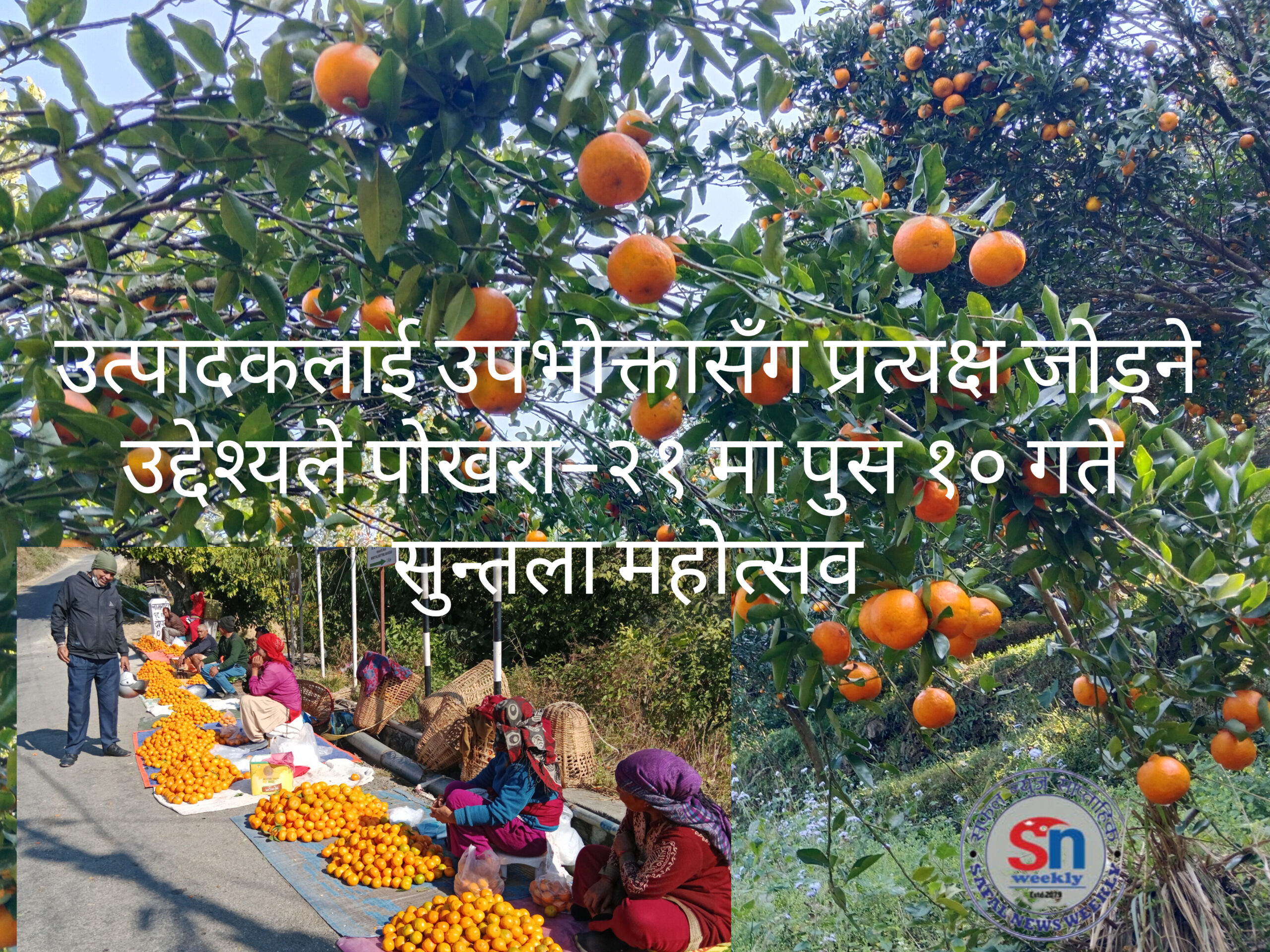 स्थानीय उत्पादनलाई प्रवर्द्धन गर्दै कृषक र उपभोक्ताबीच प्रत्यक्ष सम्बन्ध स्थापित गर्ने उद्देश्यले पोखरा–२१ मा सुन्तला महोत्सव आयोजना गर्ने तयारी भइरहेको छ। महोत्सवले सुन्तलाको बजार विस्तार मात्र होइन, पोखरालाई कृषि पर्यटनसँग जोड्ने अवसर पनि सिर्जना गर्ने अपेक्षा गरिएको छ।