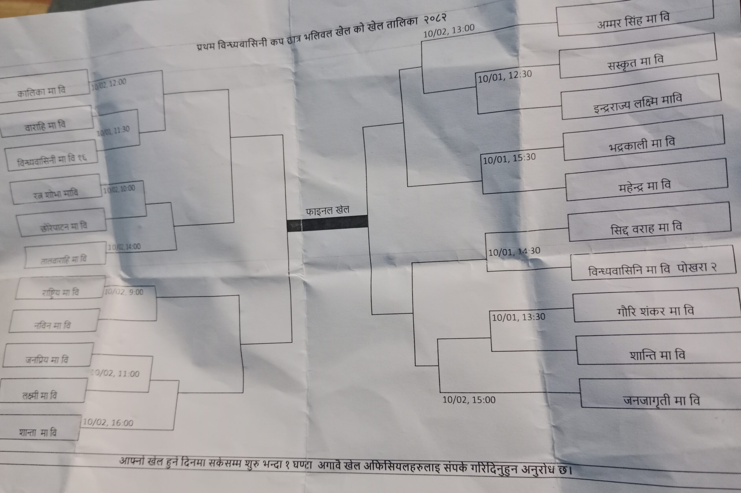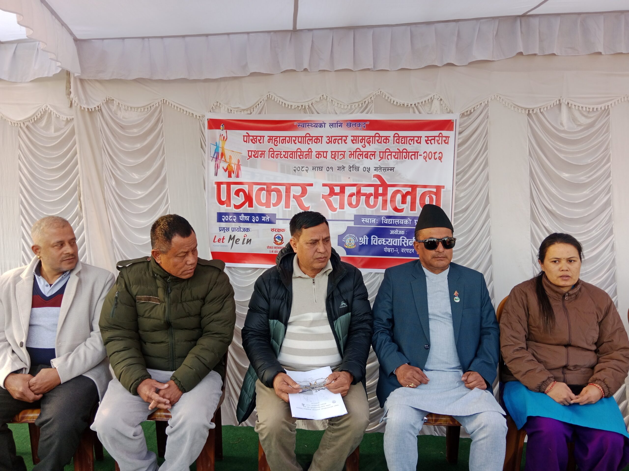 एकराज गिरी/पाेखरा,पुस ३० गते ।प्रथम विन्ध्यवासिनी कप पाेखरा महानगरपालिक सामुदायिक विद्यालय स्तरीय छात्र भलिबल प्रतियोगिता–२०८२ हुने भएकाे छ । पाेखरा-२ बरपाटनमा रहेकाे विन्ध्यवासिनी माध्यमिक विद्यालयकाे आयाेजनामा भाेलि माघ १ गतेबाट प्रतियाेगिता संचालन हुने आज आयाेजित पत्रकार सम्मेलनमा जानकारी दिइएकाे हाे ।प्रतियाेगिता माघ ५ गतेसम्म विद्यालय प्राङ्गणमा संचालन हुने छ ।