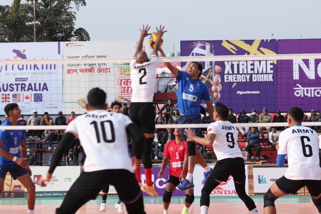 पोखरा रंगशालास्थित भलिबल कोर्टमा जारी च्याम्पियनसिपअन्तर्गत आजको अन्तिम खेलमा पुलिसले आर्मीलाई ३–१ को सेटमा पराजित गरेको हो । पहिलो सेट २२–२५ र दोस्रो सेट १६–२५ ले गुमाएको आर्मीेले तेस्रो सेटमा २५–२१ ले जित निकाल्दै खेलमा फर्किने कोसिस गरेपनि सफल हुन सकेन । चौथो सेटमा पुलिसले २५–१५ ले जित निकाल्दै आर्मीलाई पहिलो हार चखायो ।