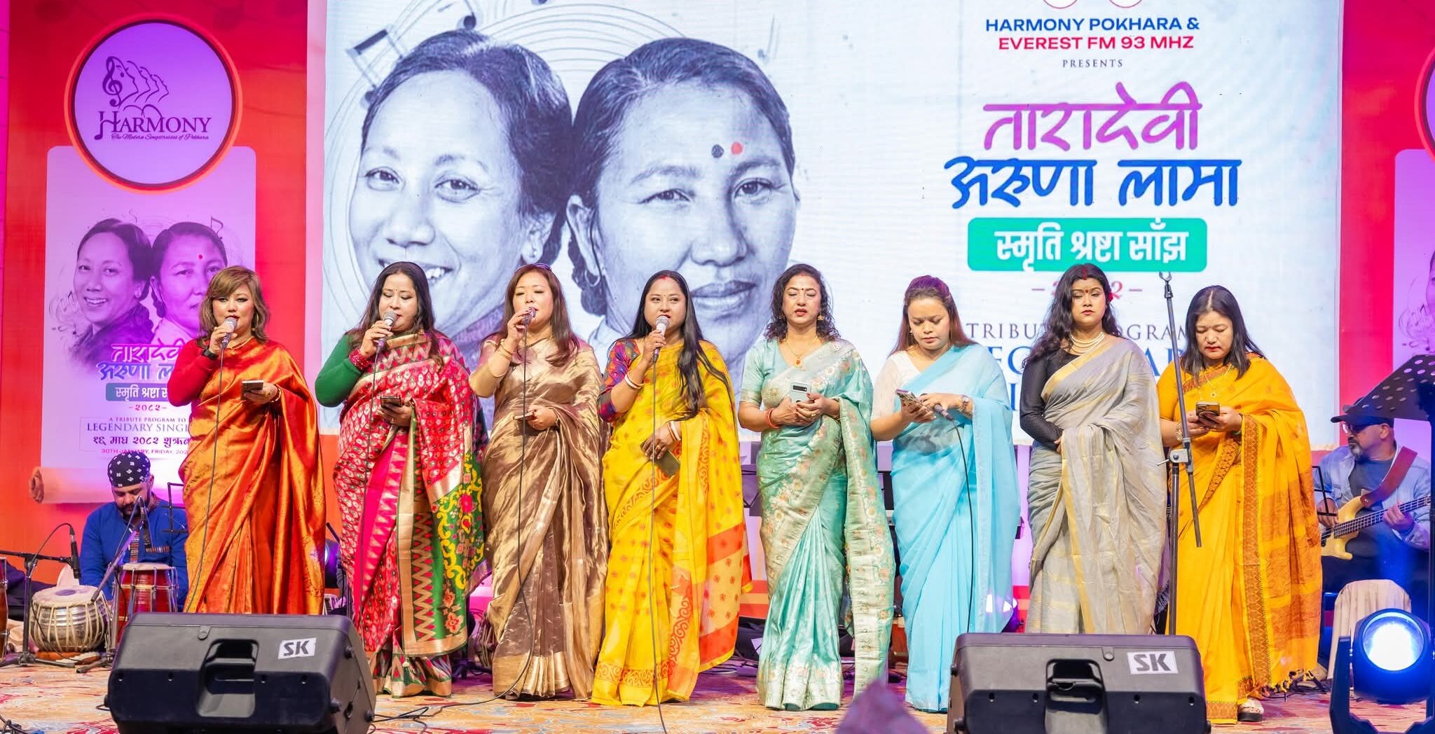 पोखरा महानगरपालिकाको प्रवद्र्दनमा आयोजित श्रष्टा स्मृति साँझमा हार्मोनीका कलाकारहरुले सामुहिक बन्दना र त्यसलगत्तै लगातार तारादेवी र अरुणा लामाका कालजयी गीतहरु ‘शुभकामना भरी’, ‘उकाली ओरालीहरुमा’, ‘पोहोर साल’, ‘एक फूल झरेर के भो ? ’, ‘ए कान्छा ठट्टैमा’, ‘हेर न हेर कान्छा’, ‘फूललाई सोंधे’ गुञ्जाउँदै स्वर किन्नरी द्वयलाई श्रद्दाञ्जली अर्पण गर्दै गुञ्जाएपछि कार्यक्रम शुरु भएको थियो । त्यसपछि पालैपालो स्टेजमा उक्लिएका गायीकाहरु ईतु जोजिजु, शितल थापा, कौशल्या गुरुङ, रजनी ऋदम राई, लक्ष्मी गिरी, मितु पाल र बबी दियाली रसाईलीले सांगीतिक प्रस्तुती दिए । जहाँ उनीहरुले तारादेवी र अरुणा लामाका एकपछि अर्को गर्दै गीतहरु गुञ्जाउँदा दर्शक नोस्टाल्जिक बने भने आफ्नै गीत सुनाउँदा दर्शक आल्हादित बने । कार्यक्रममा ईतुले अरुणा लामाको ‘मैले जीवनलाई कसरी सजाएँ’ र ‘आफ्नो र त्यो कहिले घाम, कहिले छायाँ’, सितल थापाले तारादेवीका ‘टाढाबाट बोलाएको’ र ‘जति माया लाएपनि’, कौशल्या गुरुङले तारादेवीको ‘जताततै खोजें’ र आफ्नो ‘जून राम्रो जुनेली रातको’, रजनी ऋदम राईले अरुणा लामाको ‘भेटिनु छुटिनु’ र आफ्नो ‘को छ र मेरो’, लक्ष्मी गिरीले अरुणा लामाको ‘उदास मेरो जीवन कथा’ र आफ्नो ‘हिमालकी प्यारी छोरी’, मितु पालले अरुणा लामाको ‘हाँसी राखें, बोली राखें’ र आफ्नो ‘परिभाषा हराएको’ तथा बबी दियाली रसाइलीले तारादेवीको ‘जबजब मेरा सपनाहरु’ गीत भ्वाईलिनको साथमा गुञ्जाएका थिए ।