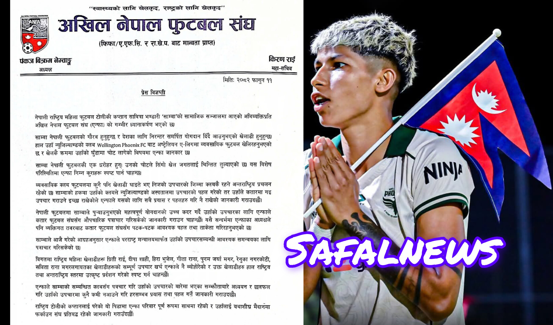 पोखरा, फागुन ११ — अखिल नेपाल फुटबल संघ (एन्फा) ले नेपाली राष्ट्रिय महिला फुटबल टोलीकी कप्तान सावित्रा भण्डारी ‘साम्बा’ले सामाजिक सञ्जालमार्फत व्यक्त गरेको अभिव्यक्तिप्रति गम्भीर ध्यानाकर्षण भएको जनाएको छ।