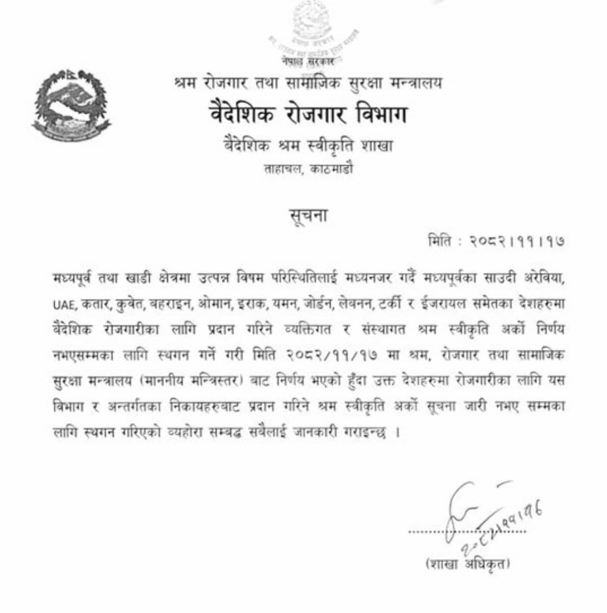 काठमाडौंस्थित बैदेशिक श्रम स्वीकृति शाखा, ताहाचलबाट जारी सूचना अनुसार मिति २०८२ फागुन १७ गते माननीय मन्त्रिस्तरबाट भएको निर्णय बमोजिम साउदी अरेविया, यूएई, कतार, कुवेत, बहराइन, ओमान, इराक, यमन, जोर्डन, लेवनन, टर्की र इजरायल लगायतका देशमा वैदेशिक रोजगारीका लागि प्रदान गरिँदै आएको व्यक्तिगत तथा संस्थागत श्रम स्वीकृति अर्को निर्णय नभएसम्मका लागि स्थगन गरिएको हो।