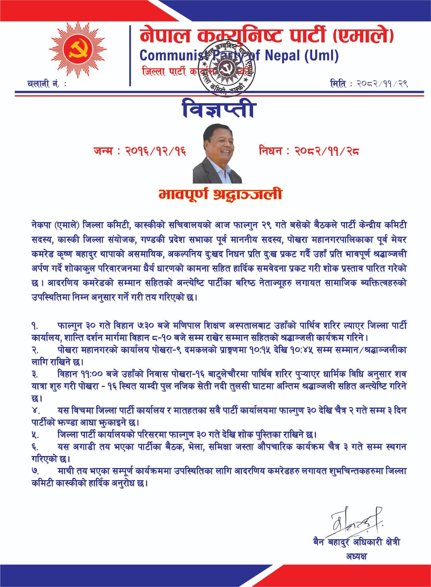 यसैबीच जिल्ला पार्टी कार्यालय तथा मातहतका सबै पार्टी कार्यालयमा फागुन ३० गतेदेखि चैत २ गतेसम्म तीन दिन पार्टीको झण्डा आधा झुकाइनेछ। जिल्ला पार्टी कार्यालय परिसरमा फागुन ३० गतेदेखि शोक पुस्तिका पनि राखिनेछ।