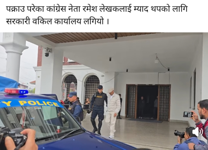 काठमाडौँ । पूर्वगृहमन्त्री तथा नेपाली कांग्रेसका नेता रमेश लेखकलाई सरकारी वकिलको कार्यालयमा लगिएको छ ।