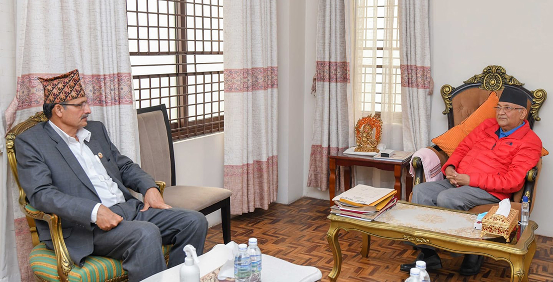 काठमाडौं । प्रधानमन्त्री केपी शर्मा ओलीसँग प्रतिनिधिसभाका सभामुख अग्निप्रसाद सापकोटाले बालुवाटारमा भेटघाट गरेका छन् ।प्रतिनिधिसभा पुन:स्थापना भएयता प्रधानमन्त्री र सभामुखबीच पहिलोपटक भेट भएको हो।