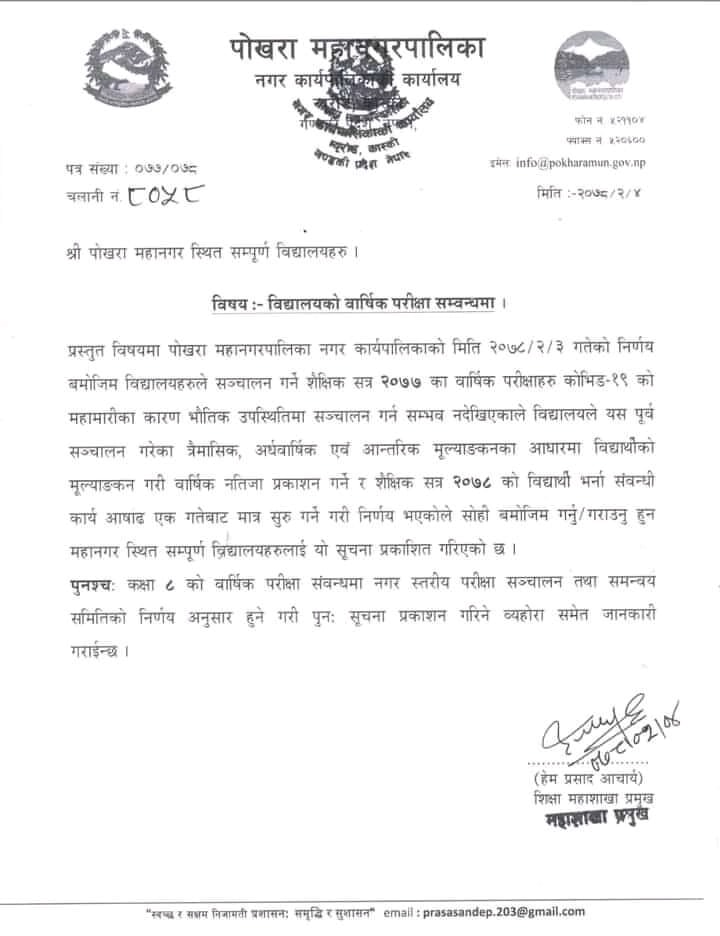 पोखरा, जेठ ४ गते । पोखरा महानगरपालिकाका विद्यार्थीले बार्षिक परीक्षा दिनुनपर्ने भएको छ । महानगर शिक्षा महाशाखाले मंगलबार महानगरका विद्यलायहरुलाई सुचना जारी गदै महामारीका कारण भौतिकरुपमा परीक्षा सञ्चालन गर्न असम्भव भएकाले यसपूर्व सञ्चालन गरेका त्रैमासिक, अर्धवार्षिक परीक्षा एवं आन्तरिक मूल्यांकनका आधारमा मूल्यांकन गरी नतिजा प्रकाशन गर्न निर्देशन दिएको हो ।