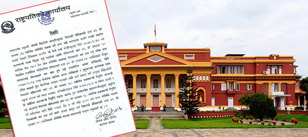 काठमाडौं, जेठ ७ गते । राष्ट्रपति विद्यादेवी भण्डारीले बहुमतप्राप्त वैकल्पिक सरकार गठनका लागि पुनः आव्हान गर्नुभएको छ । प्रधानमन्त्री केपी शर्मा ओलीले प्रतिनिधिसभाबाट विश्वासको मत नलिने प्रष्ट पार्नुभएपछि राष्ट्रपति भण्डारीले संविधानको धारा ७६ को उपधारा ५ अनुसार वैकल्पिक सरकार निर्माणको आज विहिबार आव्हान गर्नुभएको हो ।