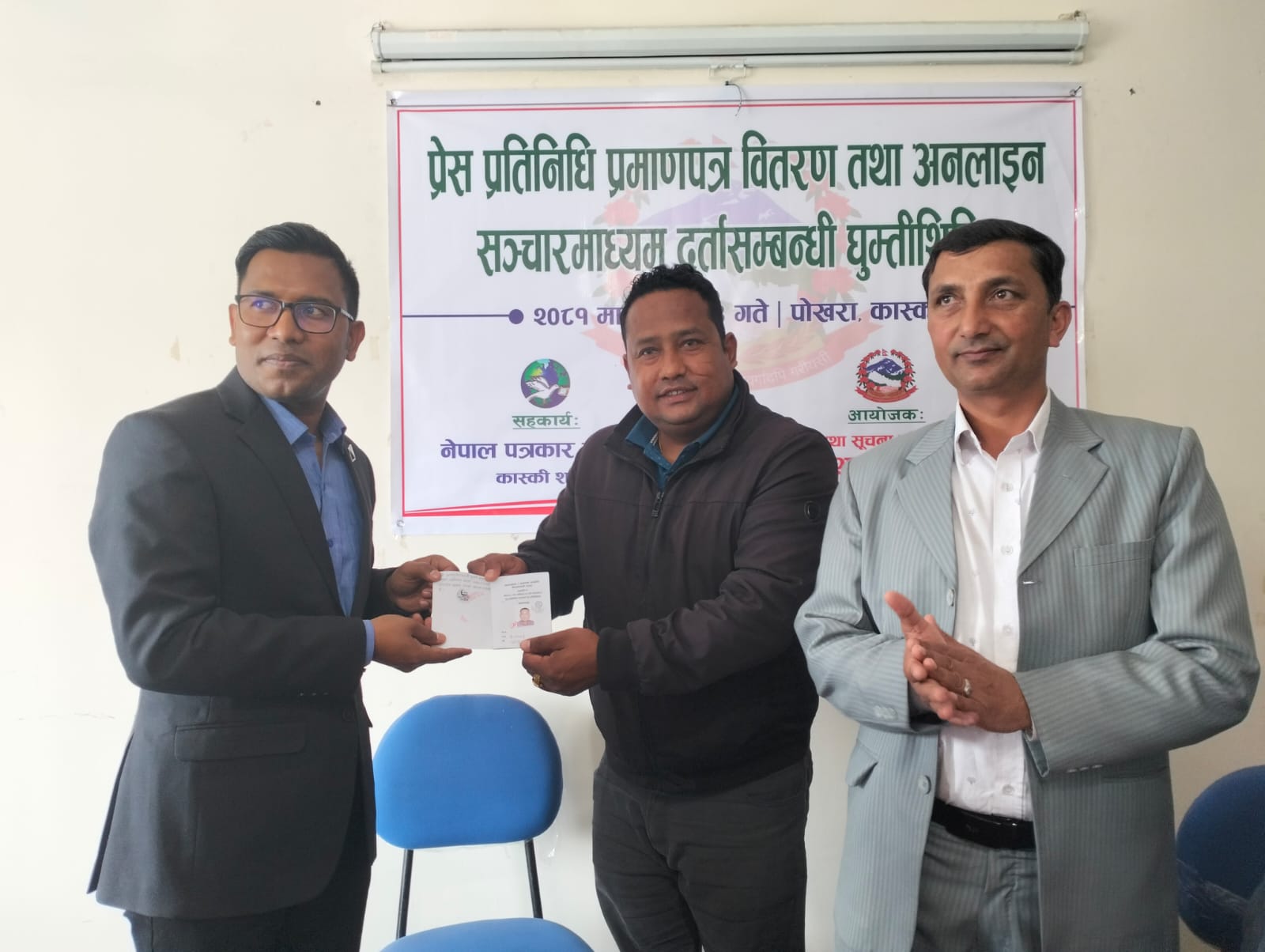 पोखरा । सूचना तथा प्रसारण विभागले पोखरामा घुम्ती सेवा शिविर सञ्चालन गरेको छ । पत्रकार महासंघ कास्कीको सहकार्यमा सञ्चालित २ दिने शिविरको बुधबार सूचना तथा प्रसारण विभागका महानिर्देशक प्रदीप परियारले पहिलो सेवाग्राही योगेन्द्र श्रेष्ठलाई प्रेस प्रतिनिधि पास वितरण गरेर शुभारम्भ गर्नुभयो ।